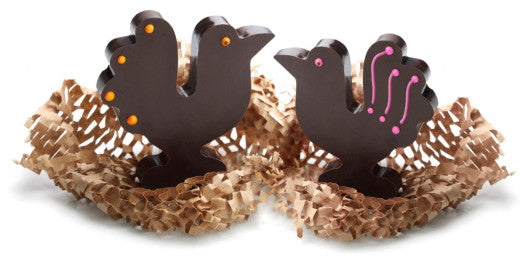 Cute & sassy, our intense chocolate ganache gives Tom & Sally character. Their dark chocolate coats and orange & pink accessories give them their good look looks. An ultra chic delicious duo!